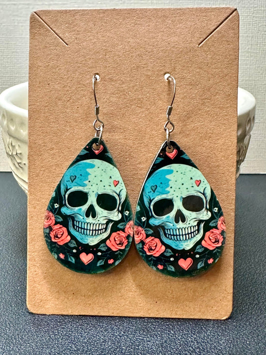 White Skull & Pink Rose Teardrop Earrings