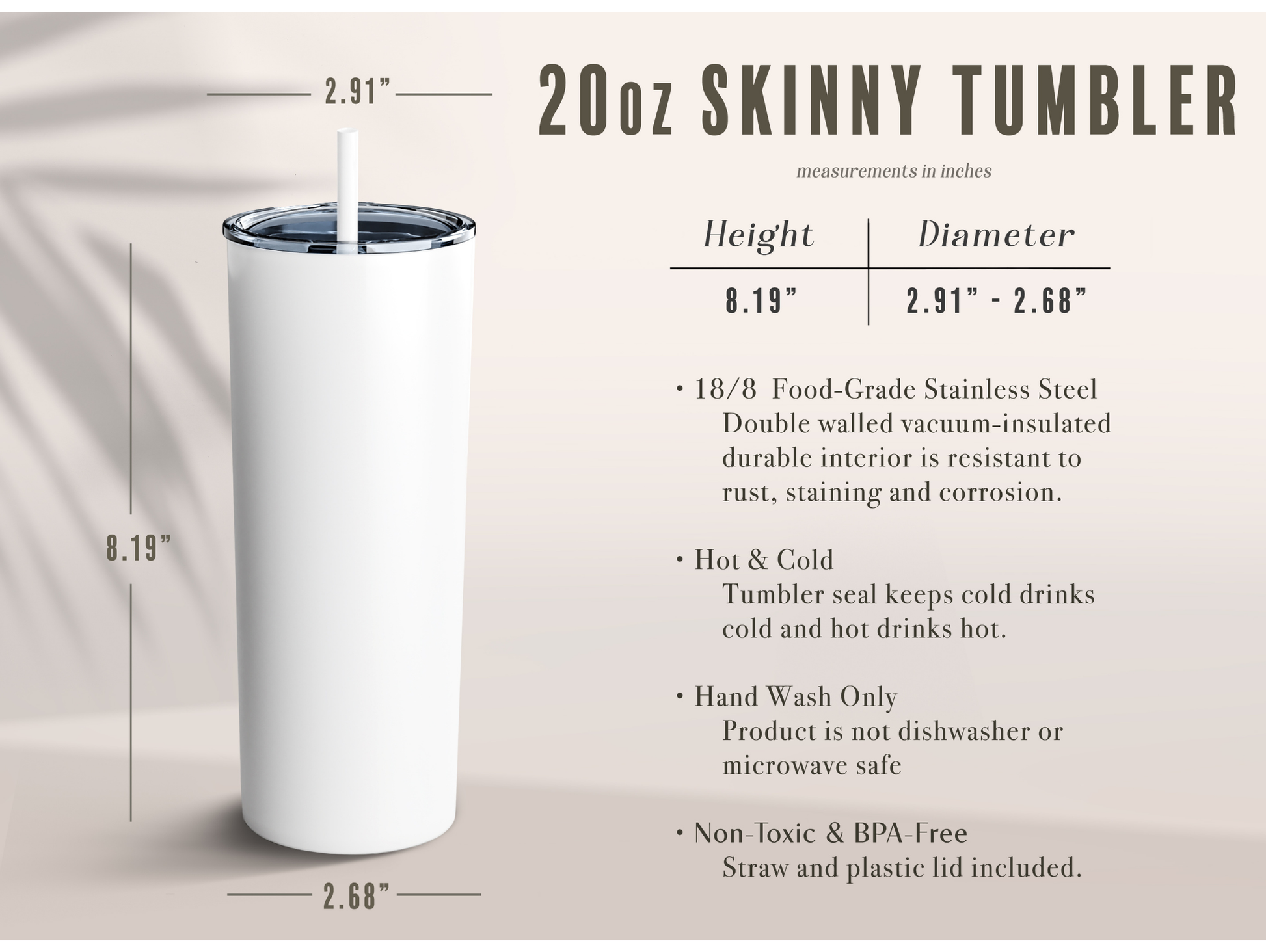 Enjoy your favorite beverage in our vibrant 20oz skinny tumblers! This tumbler would be a great gift for someone special in your life, or a "just because" gift to brighten someone's day.
